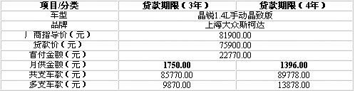 貸款解析:晶銳早在上市之初就被眾多消費者所關注,相比競爭對手本田飛度,本田鋒范,馬自達2等車型來說,晶銳在定價方面有一定的優(yōu)勢,時尚精致的外觀和上海大眾品牌的良好口碑,使它的市場表現比較不錯。首付2萬余元,月供近1400元的貸款購車方式也比較誘人。