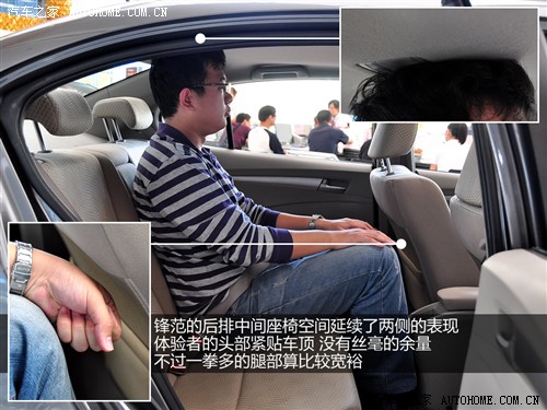 得益于較長(zhǎng)的軸距,鋒范在內(nèi)部縱向空間上的表現(xiàn)的確出色。但由于前排座椅設(shè)計(jì)的更為厚實(shí)一些,因此體驗(yàn)者的腿部空間依然是和飛度上相同的兩拳。即便是換坐到中間座位,腿部依然有較出色的一拳多。此外鋒范的后排地板和飛度一樣屬于略有凸起但不影響舒適性的范疇。不過(guò)鋒范在內(nèi)部垂直空間的表現(xiàn)上實(shí)難令人滿(mǎn)意,雖然車(chē)頂有為爭(zhēng)取更多頭部空間而設(shè)計(jì)的內(nèi)凹造型,但實(shí)際效果不明顯?傊阡h范內(nèi),體驗(yàn)者的頭部壓抑和不適感十分明顯。