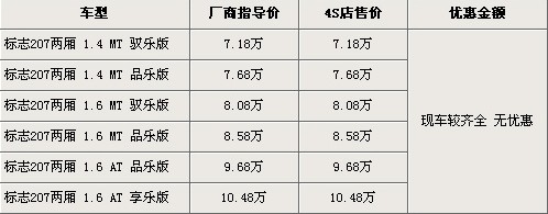 據(jù)東風(fēng)標(biāo)致北京地區(qū)4S店銷售人員介紹,標(biāo)致207兩廂共有6款車型,售價(jià)區(qū)間為7.18萬(wàn)-10.48萬(wàn)元。目前標(biāo)致207兩廂全系暫無(wú)現(xiàn)金優(yōu)惠,并且現(xiàn)車比較全。