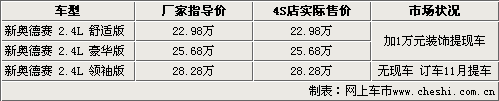 據(jù)北京地區(qū)廣州本田4S店銷售人員介紹,新款?yuàn)W德賽在上市之前訂單數(shù)量已經(jīng)非常火爆,上市之初各經(jīng)銷商只有展車和試駕車。目前訂單數(shù)量仍在增加,只有部分4S店有部分現(xiàn)車銷售,消費(fèi)者要提現(xiàn)車的話則必須要加裝1萬(wàn)元的裝飾。如果訂車的話需要繳納5000元-1萬(wàn)左右訂金,11月初才能提到車。