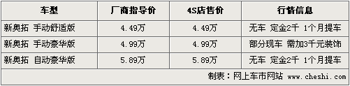 據(jù)長(zhǎng)安鈴木北京地區(qū)4S店銷售人員介紹,目前新奧拓銷售火爆,只有手動(dòng)豪華版有現(xiàn)車,以藍(lán)色、白色、金色為主,提車需要在4S店加裝3000元裝飾。其余車型及顏色需要預(yù)訂,定金為2000元,最快1個(gè)月可提車。北京地區(qū)各4S店由于訂單不同,各店銷售的現(xiàn)車顏色有所不同。