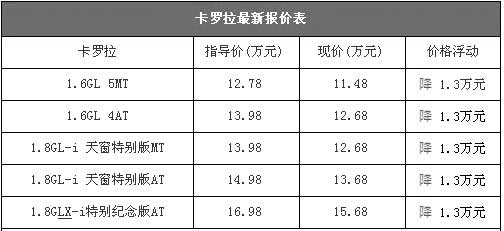 最近一段時(shí)間,卡羅拉的銷售情況一直都非常不錯(cuò),因此其價(jià)格相對(duì)來說也比較穩(wěn)定。近日,我們從北京的一些一汽豐田汽車綜合經(jīng)銷商處了解到,目前卡羅拉可優(yōu)惠1.3萬元,比9月份的價(jià)格下降了3000元,和其歷史最低價(jià)已經(jīng)非常接近。以下是卡羅拉部分車型最新報(bào)價(jià)表: