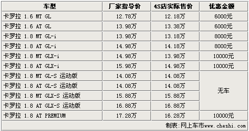 據(jù)一汽豐田4S店銷售人員介紹:目前2.0L排量的運動版車型無現(xiàn)車銷售,購買其他車型則可以享受到8000元——10000元的現(xiàn)金優(yōu)惠。入門級的1.6 MT GL版車型售價降到了12.18萬元,高配的1.8 AT PREMIUM版經(jīng)10000元優(yōu)惠后,售價也降到了16.28萬元。