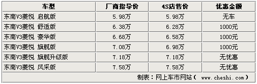 據(jù)東南經(jīng)銷商處銷售人員介紹,目前V3菱悅風(fēng)采版及升級后的旗艦版正在逐步充足貨源,最低配的車型仍因尚未投產(chǎn)而無法購買,請消費(fèi)者諒解。V3風(fēng)采版系列車型各店已少量到店,而升級后的旗艦版V3也正在全國配送當(dāng)中。銷售人員還說,現(xiàn)在購車不論風(fēng)采版還是升級的旗艦車型均沒有任何形式的現(xiàn)金優(yōu)惠,僅有精美的裝飾贈送。而老款的V3菱悅旗艦版則可以優(yōu)惠1000元。