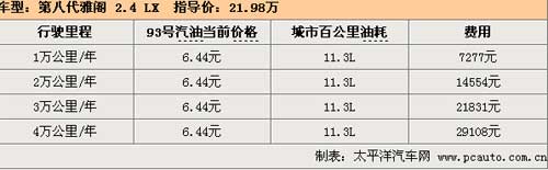 保險方面,指導價為21.98萬的第八代雅閣 2.4 LX購買了第三者50萬元責任險,每年的保險費用為8350元。