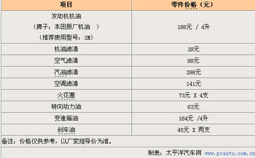 廣汽本田為雅閣提供3年或十萬公里的質保期限,首保是在5000公里,以后每過5000公里保養(yǎng)一次。與大多數(shù)日系車型相同,廣汽本田對雅閣車型機油機濾更換周期的官方建議是5000公里,廣汽本田4S店一般建議車主使用級別較高的SM級本田原裝機油。每次常規(guī)保養(yǎng)用料費用為217元,加上200元的更換機油機濾工時費一共是417元。在4萬公里內進行常規(guī)保養(yǎng)總共6次。到了2萬公里的時候,車主要在常規(guī)保養(yǎng)基礎上增加空氣濾清與空調濾清的保養(yǎng),保養(yǎng)費用也相應的增加,需要707元。而到了4萬公里的時候要進行一次大保養(yǎng),需要更換機油機濾、空氣濾清、空調濾清、汽油濾清、火花塞與變速箱油,而保養(yǎng)費用也需要過千元,達到1611元。