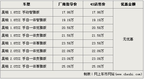 據(jù)北京斯柯達(dá)經(jīng)銷店銷售人員介紹,斯柯達(dá)昊銳共分為8個(gè)車型,售價(jià)區(qū)間為17.99-25.09萬(wàn)元。目前店內(nèi)昊銳雖然沒(méi)有任何優(yōu)惠,但是店內(nèi)的昊銳現(xiàn)車比較充足,消費(fèi)者挑選的空間也較大。