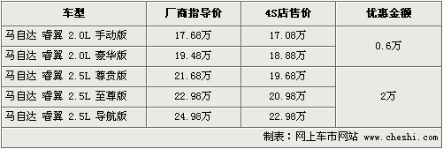 據(jù)一汽馬自達(dá)4S店銷(xiāo)售人員介紹,目前睿翼2.0L車(chē)型開(kāi)始有小幅優(yōu)惠,現(xiàn)金優(yōu)惠6千元或購(gòu)車(chē)送導(dǎo)航,而2.5L車(chē)型全系優(yōu)惠達(dá)到了2萬(wàn)元,現(xiàn)車(chē)顏色以黑色、銀色為主。另外2.5L尊貴版優(yōu)惠后售價(jià)為19.68萬(wàn)元,只和2.0L豪華版相差8千元,值得消費(fèi)者考慮一下。睿翼部分顏色還需預(yù)訂,訂金只需500元,最快1周就可以提到車(chē)。如消費(fèi)者有意購(gòu)買(mǎi),到店詳談會(huì)有更優(yōu)惠的價(jià)格。北京地區(qū)各4S店由于訂單不同,各店銷(xiāo)售的現(xiàn)車(chē)顏色有所不同。