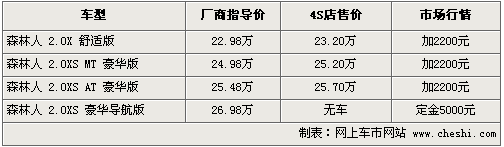 據(jù)斯巴魯4S店銷售人員介紹,目前森林人全系店內(nèi)的實(shí)際銷售價(jià)格比原來指導(dǎo)價(jià)增加了2248元,主要原因是全系增加了倒車?yán)走_(dá)以及尾喉配置。目前2.0XS自動(dòng)導(dǎo)航版和2.5XS兩款車型均有現(xiàn)車供應(yīng),顏色主要為藍(lán)色、白色、紅色、黑色。部分顏色及車型還需要預(yù)訂,訂金為5000元,最快一個(gè)月可以提到車。另據(jù)介紹,2.0XS豪華導(dǎo)航版已停止生產(chǎn)。北京地區(qū)各4S店由于訂單不同,各店銷售的現(xiàn)車顏色有所不同。