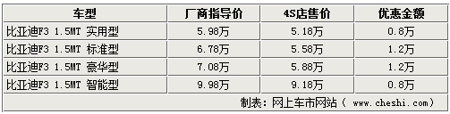 作為比亞迪汽車旗下的重點產(chǎn)品,比亞迪F3在今年又推出了智能白金版,新款車型增加了無鑰匙系統(tǒng)、智能娛樂通訊系統(tǒng)等高端配置,使這款自主品牌家用轎車的競爭力更加突出。網(wǎng)上車市網(wǎng)站了解到,雖然比亞迪F3智能白金版上市時間不長,但目前優(yōu)惠幅度有所提升,經(jīng)銷商處全系最高可給出1.2萬的優(yōu)惠。詳情如下: