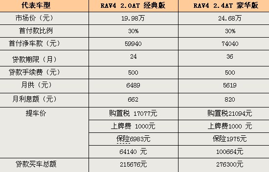 RAV4要比CRV更加野性一點,相比漢蘭達的“雄偉”,又帶一點收斂,這也正是它的獨特之處,喜歡這款車的朋友不妨也可以考慮一下貸款買車,分別有兩種方案,一種是首付三成貸款兩年,另外一種就是首付三成貸款三年。我們可以先看兩年還款方案,首付款也是三成,金額為但是兩年下來,總共買車的錢要比凈車款多出了1.6萬元,另外一種方案三年還清貸款后是要多付出2.9萬元。希望通過貸款的方式來購買這款車的朋友要根據(jù)自己的實際情況來確定方案。