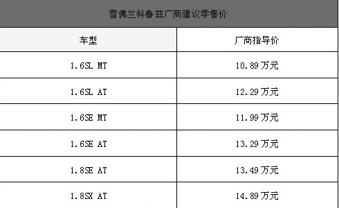 2009年4月9日,上海通用汽車公布了倍受關(guān)注的新生代性能中級(jí)車雪佛蘭科魯茲的售價(jià)。雪佛蘭科魯茲此次共有1.6L和1.8L兩款排量六種不同配置的車型,配備五速手動(dòng)和S6六速手自一體變速箱,并有六種車身顏色可供選擇,最終價(jià)格區(qū)間定為10.89-14.89萬(wàn)元。即日起全國(guó)各地的雪佛蘭經(jīng)銷商店開(kāi)始接受預(yù)訂。