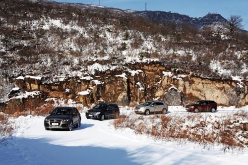 然后需要集中說明的是它們在雪地中的表現(xiàn)。我們曾在一條被積雪完全覆蓋的道路上駕駛了好一會(huì)兒,經(jīng)過反復(fù)的比較,我發(fā)覺XC60和SRX的表現(xiàn)幾乎相差無幾,兩輛車在抓地力方面不存在什么明顯的問題,最多只是在起步和停車時(shí)會(huì)發(fā)生一些打滑,它們最主要的問題是方向盤在這種情況下會(huì)完全喪失路感,這讓人在駕駛時(shí)不免感到戰(zhàn)戰(zhàn)兢兢。Q5的情況要比前面提到的兩臺車稍好一些,但一旦稍微快一些就會(huì)讓人產(chǎn)生信心不足的感覺,在同樣的條件下quattro發(fā)生打滑的次數(shù)明顯較SRX和XC60來得少。GLK無疑是在這種路面上表現(xiàn)最杰出的車型,在普通道路上略顯閑散的方向盤在這種路面上卻能得到充分的信息反饋,而且GLK是唯一在這種路面能讓人放心給油快速前行的車輛,所以GLK無疑是在低牽引力條件的路面上表現(xiàn)最好的車型。
