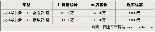 據(jù)4S店銷售人員介紹,目前C4大畢加索現(xiàn)車可優(yōu)惠現(xiàn)金5000元, 全系車型有舒適版和豪華版兩款車型,售價(jià)分別為27.68萬和30.68萬。目前現(xiàn)車供貨比較充足,現(xiàn)車顏色也比較齊全。