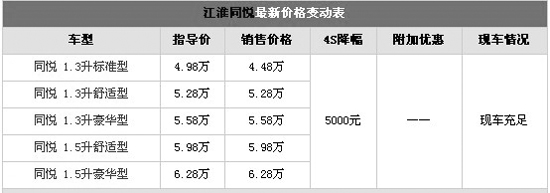江淮同悅有1.3L和1.5L兩種排量,全為手動檔車型。分標(biāo)準(zhǔn)型、舒適型和豪華型三種配置。標(biāo)準(zhǔn)型無安全氣囊,配備有ABS制動防抱死系統(tǒng),四門車窗和電調(diào)后視鏡;舒適型增添了駕駛座安全氣囊、倒車?yán)走_、遙控鑰匙和中控;豪華型相對于舒適型升級了副駕安全氣囊和前霧燈安全配置,配備了單碟CD機并升級了音響系統(tǒng),增加了后視鏡加熱功能和鋁合金輪轂。