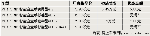 據(jù)比亞迪汽車4S店銷售人員介紹,目前比亞迪F3智能白金版只有實用型和豪華型有現(xiàn)車銷售,智能型和標準型都現(xiàn)車不足。現(xiàn)在購買比亞迪F3智能白金版可以有較大的優(yōu)惠幅度,其中實用型可以優(yōu)惠5300元;豪華型也可優(yōu)惠7800元。該比亞迪4S店銷售人員表示,如果到店詳談,還可以有更多的優(yōu)惠幅度。