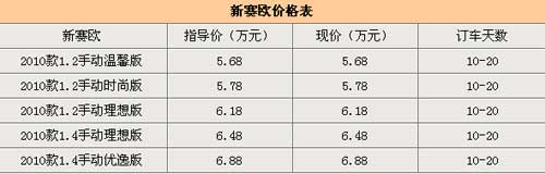 新賽歐展車已經(jīng)全面到達(dá)各地4S店,交訂金2000元-5000元不等可以訂車。最早可以在20號之前提車,最晚月底之前也可以提現(xiàn)車。有的一級城市現(xiàn)在就有現(xiàn)車可提,不過車型和顏色還是不太齊全。