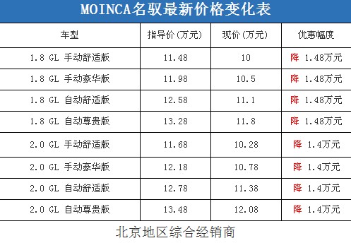近日,編輯從北京地區(qū)綜合經(jīng)銷商處了解到,現(xiàn)代MOINCA名馭的現(xiàn)車比較充足,即使是冷門顏色車型,預(yù)定等待的時(shí)間也不會(huì)很久。據(jù)經(jīng)銷商透露,MOINCA名馭最高可以優(yōu)惠不到1.5萬(wàn)元,并且會(huì)贈(zèng)送一些基本的汽車裝潢;但是消費(fèi)者要想以這個(gè)價(jià)格提車,需要在店內(nèi)做一條龍,其中車輛四項(xiàng)基本保險(xiǎn)可以打9.5折(約合4100-4600元左右)。以下是MOINCA名馭最新價(jià)格變化表: