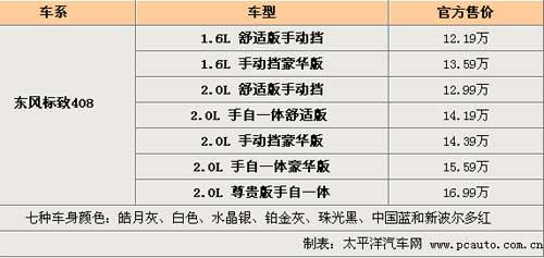 1月25日,東風標致408在北京全球首發(fā)上市,這是標致汽車品牌創(chuàng)立120年以來,首次在海外市場全球首發(fā)其最新一代車型,同時公布了全系車型的售價。此次上市的東風標致408系列共有7款車型,分為舒適版、豪華版、尊貴版三種配置版本,以配備CVTS-II技術的2.0L發(fā)動機為主打產品,其價格從12.99萬元至16.99萬元;同時408系列中也包含1.6L發(fā)動機系列,其手動舒適版入門售價為12.19萬元,主打車型2.0L舒適版手自一體版售價為14.19萬元。7款車型的售價如下表: