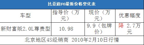 近日,編輯從北京地區(qū)比亞迪4S經銷商處了解到,近期比亞迪F6有2.0L尊貴版現(xiàn)車(黑色、銀色)。目前這款車在店內正在組織消費者團購活動,車輛全款(包括購車一條龍和購置稅、上牌)為9.9萬元,并且贈送價值1000元的汽車裝飾,相當于優(yōu)惠了2.7萬元左右。以下是比亞迪F6最新價格變化表: