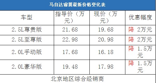 近日,編輯從北京地區(qū)一汽馬自達4S經(jīng)銷商處了解到,睿翼的2.0L車型和2.5L車型都有現(xiàn)車在售,2.5L車型在4S店的優(yōu)惠為8000元,而上市不久的2.0L車型只有禮包贈送。相比之下,綜合經(jīng)銷商處的馬自達睿翼優(yōu)惠幅度非常大,2.5L車型已經(jīng)跌破了20萬元,2.0L車型也有了1.5萬元的現(xiàn)金優(yōu)惠。以下是馬自達睿翼最新價格變化表:
