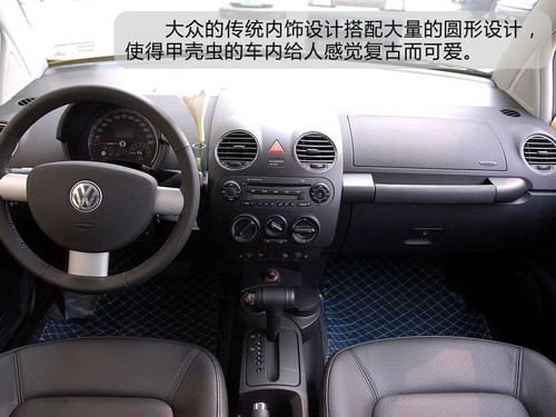 甲殼蟲的內(nèi)飾具有很明顯的大眾特征,各種開關(guān)、按鍵對于經(jīng)常駕駛大眾車輛的人來說是十分熟悉的。最特別的就是圓桶形的大儀表,速度表最大,幾乎占據(jù)了整個(gè)儀表盤面,中部是行車電腦,置于下方的是油表和轉(zhuǎn)速表。