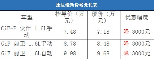 近日,編輯從北京地區(qū)一汽-大眾4S經(jīng)銷商處了解到,捷達(dá)全系有少量現(xiàn)車在售,目前店內(nèi)購車可以優(yōu)惠3000元,并且贈(zèng)送價(jià)值1400元的裝潢禮包(地膠、腳墊和車撣等)。以下是捷達(dá)最新價(jià)格變化表: