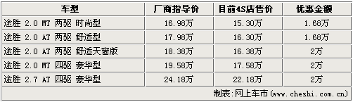 北京現(xiàn)代途勝是韓系車(chē)中非常經(jīng)典的一款城市型SUV,寬大的空間,時(shí)尚的外觀(guān)以及人性化的配置使眾多消費(fèi)者都鐘情它。據(jù)網(wǎng)上車(chē)市價(jià)格監(jiān)測(cè)系統(tǒng)顯示:目前購(gòu)買(mǎi)途勝的消費(fèi)者最高可享受到2萬(wàn)元的現(xiàn)金優(yōu)惠。具體車(chē)型見(jiàn)下表: