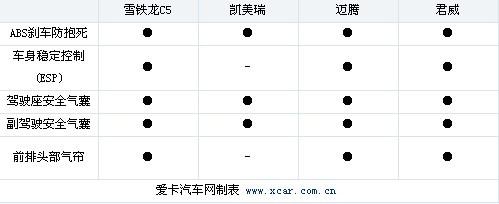 車型的安全性配置是購買者非常關注的一個因素,我們?yōu)榇蠹疫x取了五種較為常見的主被動安全配置進行比較。
