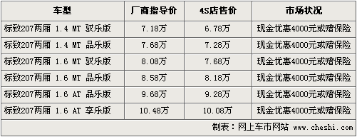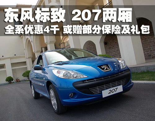 標(biāo)致207系列在推出限量版車型后,一直備受消費(fèi)者關(guān)注。兩廂207在繼承了三廂車型優(yōu)點(diǎn)的同時,又添加了許多運(yùn)動因素,更適合年輕時尚的消費(fèi)者。根據(jù)網(wǎng)上車市價格監(jiān)測系統(tǒng)顯示,目前207兩廂可以優(yōu)惠現(xiàn)金4000元,或選擇贈送4項(xiàng)保險及大禮包。具體車型行情如下: