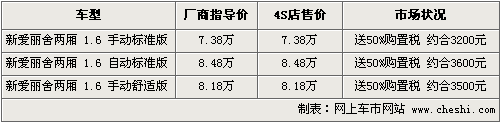 東風(fēng)雪鐵龍愛(ài)麗舍從9月份開(kāi)始,對(duì)車(chē)型進(jìn)行了一次全面升級(jí)。2010款新愛(ài)麗舍在安全、舒適、節(jié)油和性能方面比老款有增加了相應(yīng)的配置,進(jìn)一步強(qiáng)化了新愛(ài)麗舍成熟的產(chǎn)品品質(zhì)。而09款兩廂愛(ài)麗舍更具城市便利性,其備箱空間絲毫不亞于三廂車(chē)型,是繼富康后的又一經(jīng)典兩廂叫用車(chē)。根據(jù)網(wǎng)上車(chē)市價(jià)格監(jiān)測(cè)系統(tǒng)顯示,目前購(gòu)買(mǎi)愛(ài)麗舍兩廂,可享受購(gòu)置稅減半,折合最高優(yōu)惠約3600元。具體車(chē)型價(jià)格行情如下: