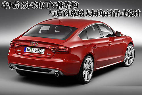 奧迪A5 Sportback四門轎跑車除加長軸距以外,依然延續(xù)奧迪A5雙門轎跑版的大部分車身結構。不過在車尾部分采取了對C柱結構與后窗玻璃改動最小的大傾角斜背式設計,增加了實用性。