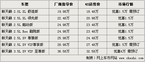 據(jù)東風(fēng)日產(chǎn)4S店銷售人員介紹,目前新天籟3.5車 型的優(yōu)惠最高可以達(dá)到4萬(wàn)元,其余車型均可以享受到1.5萬(wàn)元的現(xiàn)金優(yōu)惠,入門級(jí)車型優(yōu)惠后售價(jià)為18.48萬(wàn)。目前銷售以2.5車型為主,2.0車型、 2.5高配車型和3.5車型都需要預(yù)定,訂貨周期在1-2周時(shí)間左右。現(xiàn)車顏色方面以黑色、銀色為主。由于各店的訂單不同,各店銷售的車型和顏色有所不 同。