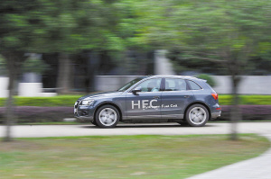 在科技日上,一款令人意想不到的氫燃料電池車——奧迪Q5 HFC(Hydrogen Fuel Cell)氫燃料電池車也出現(xiàn)在試乘車型隊(duì)伍中。我們?cè)嚦撕蟮母惺苁牵c內(nèi)燃機(jī)Q5相比,這款車的動(dòng)力毫不遜色,聲音非常安靜,而且這款車排出的只有水而沒有任何廢氣。