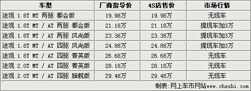據(jù)北京地區(qū)上海大眾4S店銷售人員介紹,目前國產(chǎn)途觀已經(jīng)有部分車型抵達4S店展廳,其中包括手自一體都會版、兩驅(qū)風(fēng)尚版和四驅(qū)風(fēng)尚版,消費者如果提現(xiàn)車的話,需要加價3萬元。該銷售人員表示,如果不加價預(yù)訂的話,需要半年才能提到現(xiàn)車。部分4S店表示,目前途觀有些現(xiàn)車是為已預(yù)訂的消費者準(zhǔn)備,如果該消費者退訂單,其他消費者也可以加價3萬元提走該現(xiàn)車。