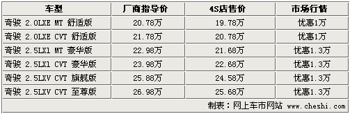 東風日產(chǎn)旗下的SUV車型——奇駿,在上市之后憑借硬朗的外形和出色的動力性能贏得了廣大消費者的關注。尤其在全程支持南極科考的旅程中,奇駿經(jīng)受了惡略環(huán)境的考驗,給消費者留下了深刻的印象。近日根據(jù)網(wǎng)上車市價格監(jiān)測顯示,目前購買2010款奇駿最高可以享受到1.3萬元的現(xiàn)金優(yōu)惠,但2.0排量車型現(xiàn)車比較緊張,部分車型和顏色需預訂。具體車型售價見下表: