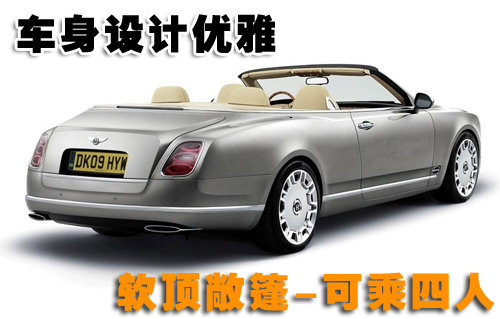 這款新車擁有與Mulsanne四門豪華轎車相同的華麗外形,采用軟頂敞篷設(shè)計,兩排座椅可舒服的乘坐四位成年人。內(nèi)飾豪華舒適,用料考究屬于奢侈級的豪華敞篷轎跑車。