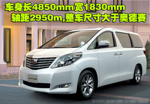 目前日本本土銷售的豐田Alphard是其第二代車型,分為兩驅(qū)和四驅(qū)兩個版本,兩驅(qū)車型的車身長4850 mm ,寬1830 mm ,高1890mm,四驅(qū)車型的車身長為4850 mm ,車寬1830 mm ,高1905mm,而軸距均為2950mm。
