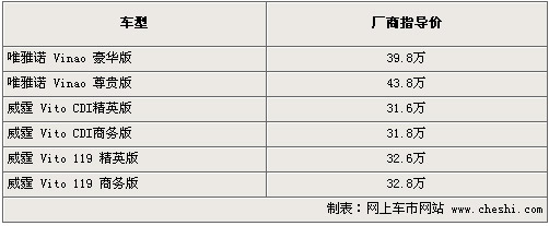2010年4月23日,前不久在福建戴姆勒工廠下線的國產梅賽德斯-奔馳唯雅諾、威霆即將正式亮相北京車展,這標志著奔馳全面吹響進入高端MPV市場的號角。新工廠的竣工投產、新產品的下線展示,揭開神秘面紗的唯雅諾、威霆在各自的展臺上格外引人注目,他們分別位于W4館和E601號。售價為:Vinao 豪華版 39.8萬;Vinao 尊貴版 43.8萬;Vito CDI精英版 31.6萬;Vito CDI商務版 31.8萬;Vito 119 精英版32.6萬;Vito 119 商務版32.8萬。