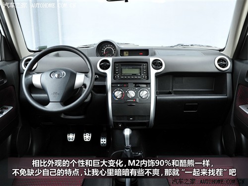 重新設(shè)計(jì)的座椅在腿部和側(cè)向支撐方面都值得稱道,不足的是,座椅并不能進(jìn)行高低調(diào)節(jié),這點(diǎn)上還沒(méi)有它的兄弟M1呢。同酷熊一樣,超大的空間也是哈弗M2最大的亮點(diǎn),身高為1.78米的乘客坐在前排調(diào)到合適的駕駛位置后,頭部到車(chē)頂還有兩拳有余的距離,后排空間的頭部和腿部的空間也是大的出奇,而且完全有資格與更高級(jí)別的車(chē)型較量。按比例放倒的后排座椅增強(qiáng)了實(shí)用性,如果將座椅全部放倒,可形成空間巨大的載貨平臺(tái)。