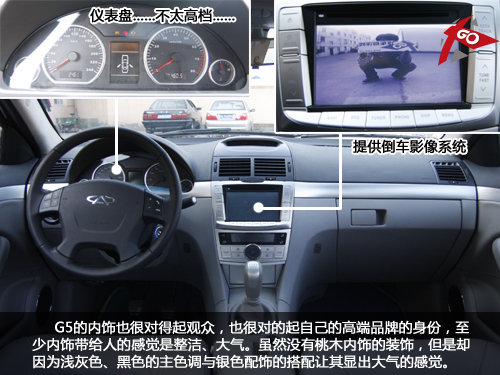GPS、倒車影像、DV……這些是G5都會擁有的配置,只是G5的液晶顯示屏所顯示出的影像并不是那么的高端……而且這儀表盤很不像是一個高端品牌所應(yīng)該有的樣式。