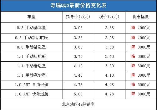 近日,編輯從北京地區(qū)4S經(jīng)銷商處了解到,奇瑞QQ3全系的現(xiàn)車充足,顏色也比較全,近期購車最高可以優(yōu)惠4000元。據(jù)經(jīng)銷商透露,這個價格就可以提到裸車,不需要附加條件,在店內(nèi)購買保險可以打9折。