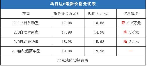 近日,編輯從北京地區(qū)方正利成一汽馬自達(dá)4S經(jīng)銷商處了解到,馬自達(dá)6的現(xiàn)車充足,優(yōu)惠幅度非常可觀,手動(dòng)擋車型降價(jià)2.5萬元,而自動(dòng)擋車型最高可以降價(jià)3萬元。據(jù)經(jīng)銷商透露,選擇分期付款,那么消費(fèi)者首付不足8萬元就可以把曾經(jīng)的“神車”開回家。