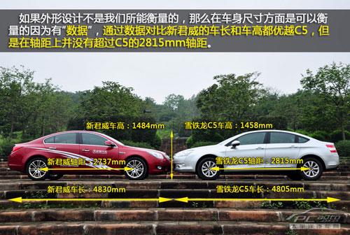 如果不是看到數(shù)據(jù),你絕對不會認為新君威比C5還要長,C5的2815mm軸距使得整個車的視覺效果相當明顯,以至于當我們把兩輛車,車頭對車頭放在一起時,在場的所有人都發(fā)出了一樣的感嘆:C5這車真大!