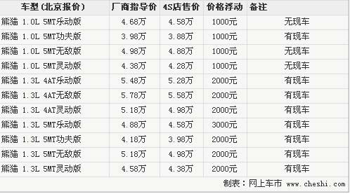 據(jù)吉利汽車4S店銷售人員介紹,吉利熊貓目前現(xiàn)車比較齊全,1.0L車型依舊僅有功夫版有現(xiàn)車,購車可享1000元現(xiàn)金優(yōu)惠。1.3L手動檔和自動檔車型均有現(xiàn)車,自動檔全系優(yōu)惠2000元,手動檔除了樂動版外其他車型優(yōu)惠2000元,樂動版優(yōu)惠3000元。