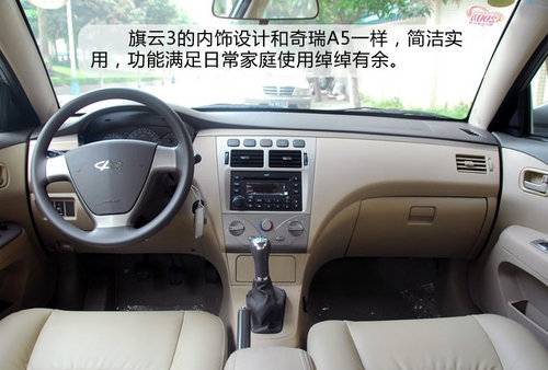 坐進(jìn)旗云3的內(nèi)部,可以發(fā)現(xiàn)布局和顏色和奇瑞A5是相同的,可以看到整個中控臺的設(shè)計十分簡潔,布局清晰,每一個功能都劃分得清晰明了,這樣的設(shè)計已經(jīng)透露了它那純粹走實用主義的設(shè)計方向。