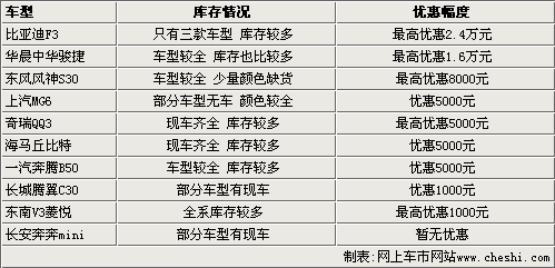 我們這次選擇了10款市場(chǎng)上銷售火爆的自主品牌車型,比如比亞迪F3、駿捷、奇瑞QQ3等車型。通過對(duì)北京市場(chǎng)的調(diào)查發(fā)現(xiàn),東南V3菱悅CVT、騰翼C30等新車型上市后,現(xiàn)車都能很快進(jìn)入終端市場(chǎng),而且出現(xiàn)了一定的優(yōu)惠幅度。而比亞迪F3、駿捷等熱銷車型,也隨著新老產(chǎn)品的更新?lián)Q代,庫存壓力變大,從而使優(yōu)惠幅度也變的更多。