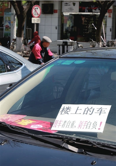 “毀車者自重、剁手自負!”昨天,東城區(qū)東四北大街43號一輛掛著警示牌的“牛車”引得路人駐足觀看、拍照。車主金先生說,放狠話是因為他的車在停車場多次被劃,希望以此嚇退劃車人。
