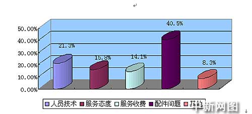 統(tǒng)計(jì)表明,服務(wù)收費(fèi)、服務(wù)態(tài)度和配件供應(yīng)在關(guān)于服務(wù)質(zhì)量的投訴中占到70%以上。同一故障反復(fù)修理過程中工時(shí)等費(fèi)用該由誰承擔(dān)的反映仍十分突出;而配件方面的投訴主要表現(xiàn)在配件供應(yīng)及時(shí)性、配件價(jià)格過高及質(zhì)量不能保證等方面。具體構(gòu)成比例:人員技術(shù)占21.3%,服務(wù)態(tài)度占15.8%,服務(wù)收費(fèi)占14.1%,配件問題占40.5%,其他占8.3%。