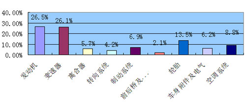 具體情況為:發(fā)動(dòng)機(jī)占26.5% ;變速器占 26.1% ;離合器占 5.7% ;轉(zhuǎn)向系統(tǒng)占4.2%;制動(dòng)系統(tǒng)占6.9%;前后橋及懸架系統(tǒng)占 2.1% ;輪胎13.5%;車身附件占 6.2% ,空調(diào)系統(tǒng)8.8%。